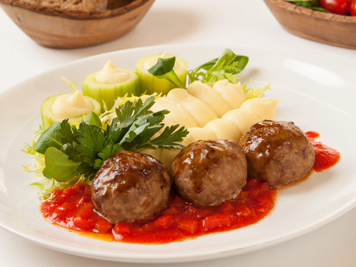 Тефтели под красным соусом с картофельным пюре с фаршированными огурцами